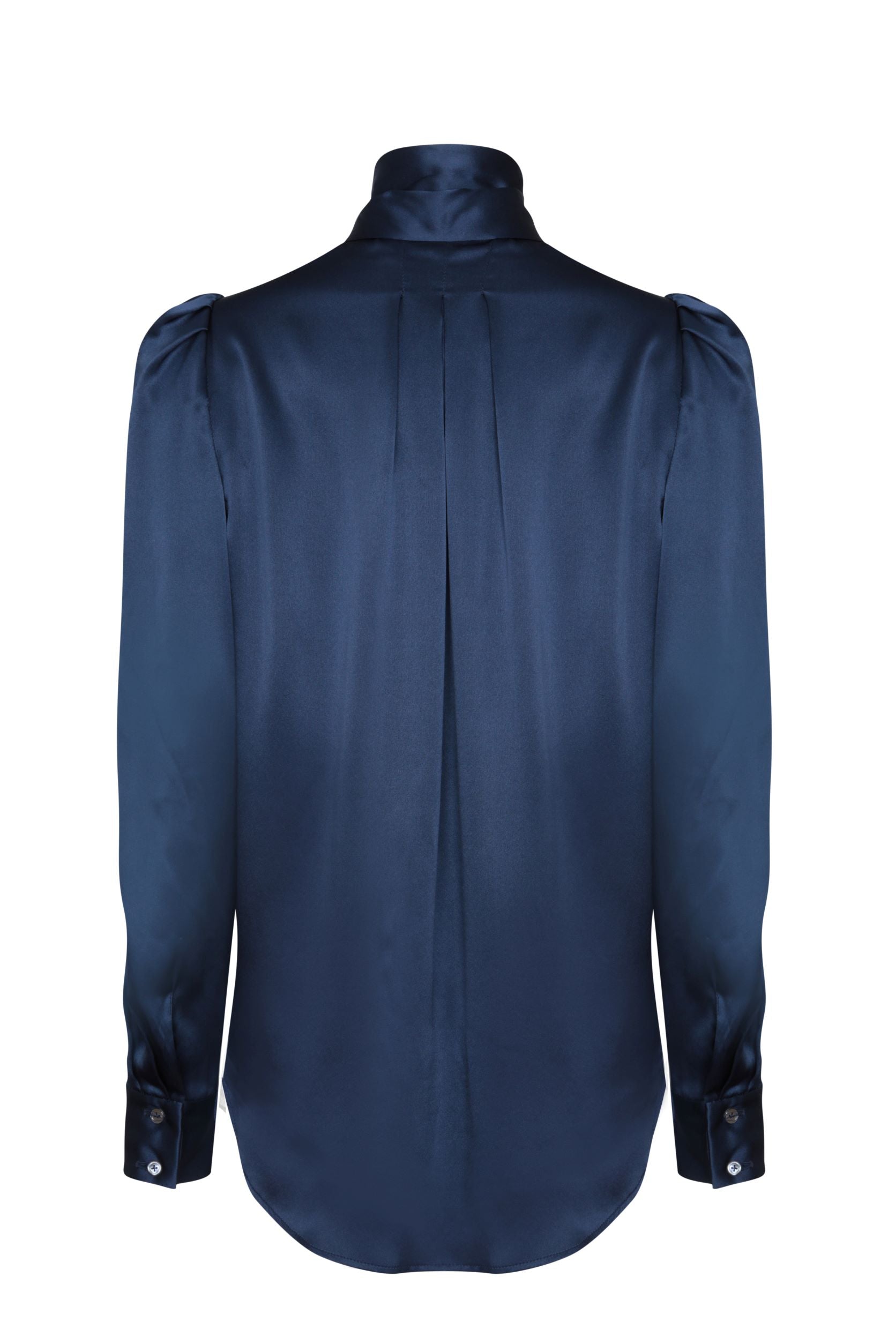 Tie-neck blouse with puffed sleeves and double button cuffs in luxurious silk satin.