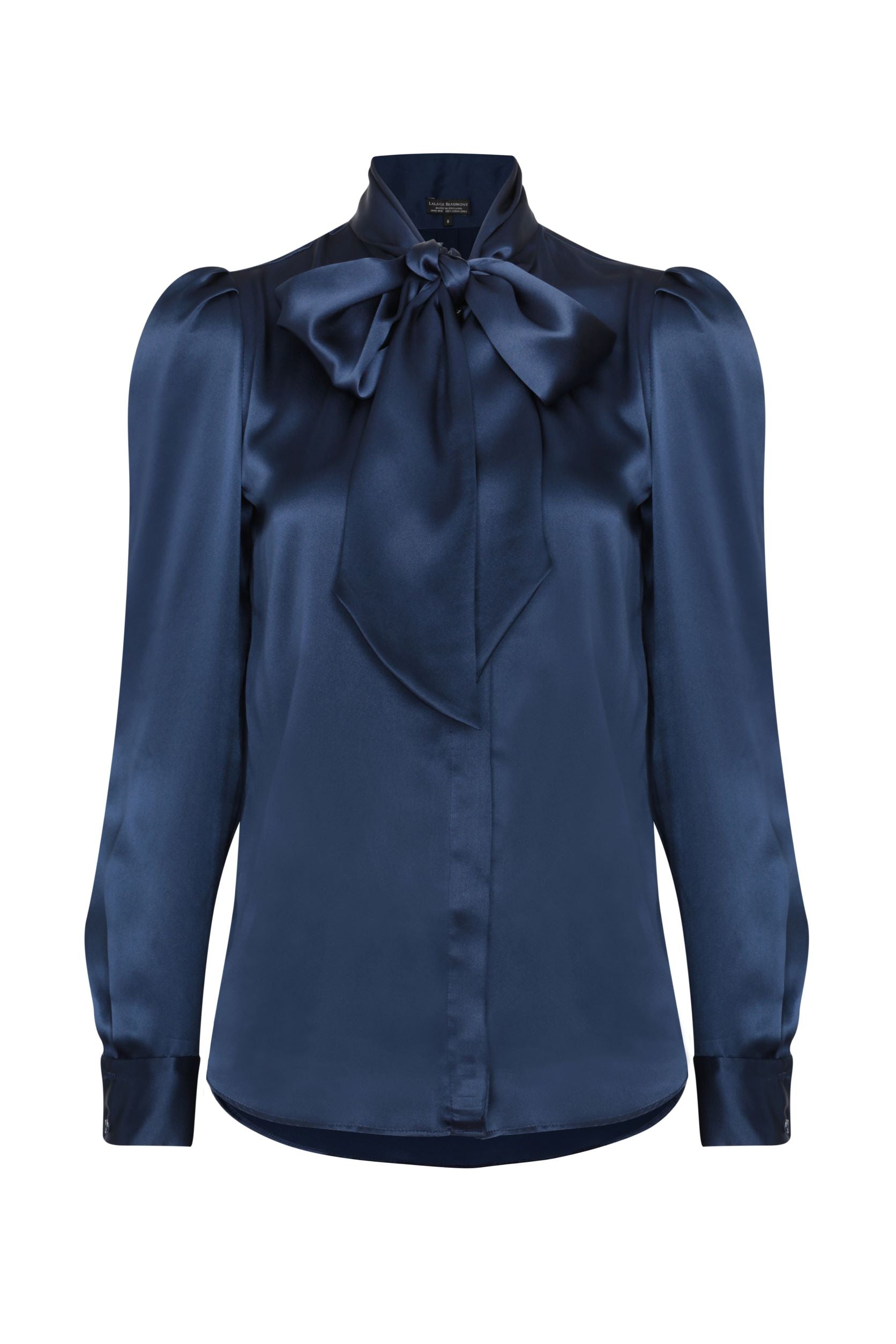 Tie-Neck Blouse in Navy Silk Satin - Denisa