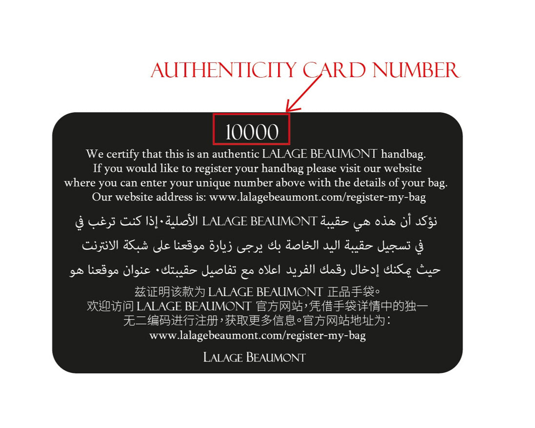 All Lalage Beaumont handbags contain an authenticity card to verify that you have received an authentic Lalage Beaumont handbag.