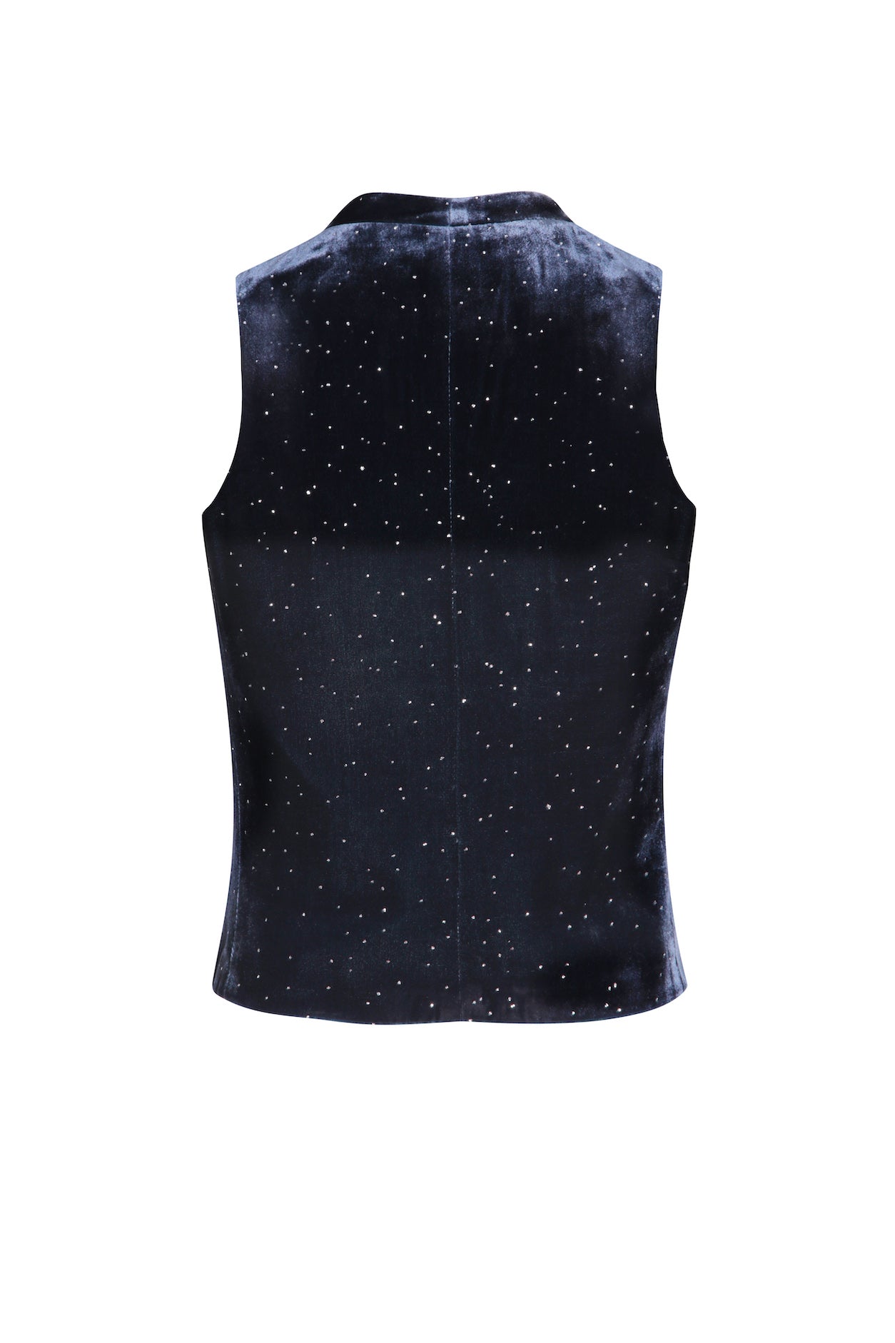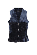 Simple and stylish waistcoat in sparkle navy blue velvet adorned with Mother of Pearl shell buttons. Super chic when paired with the coordinating Phoebe trousers, and/or the matching Imogen jacket.